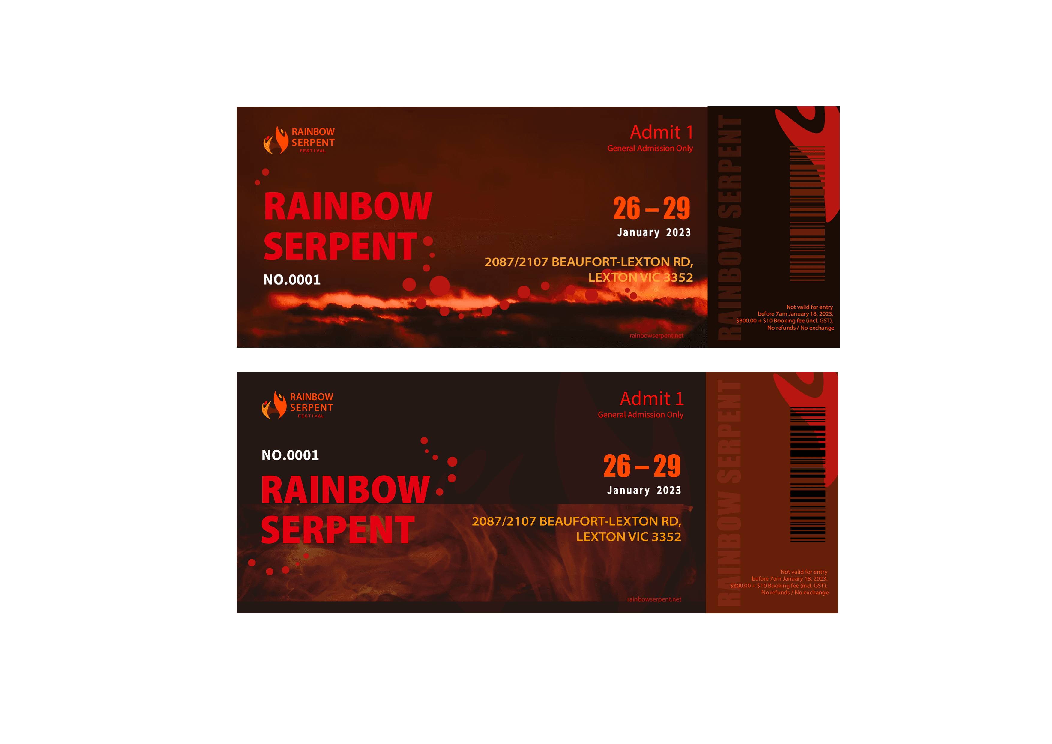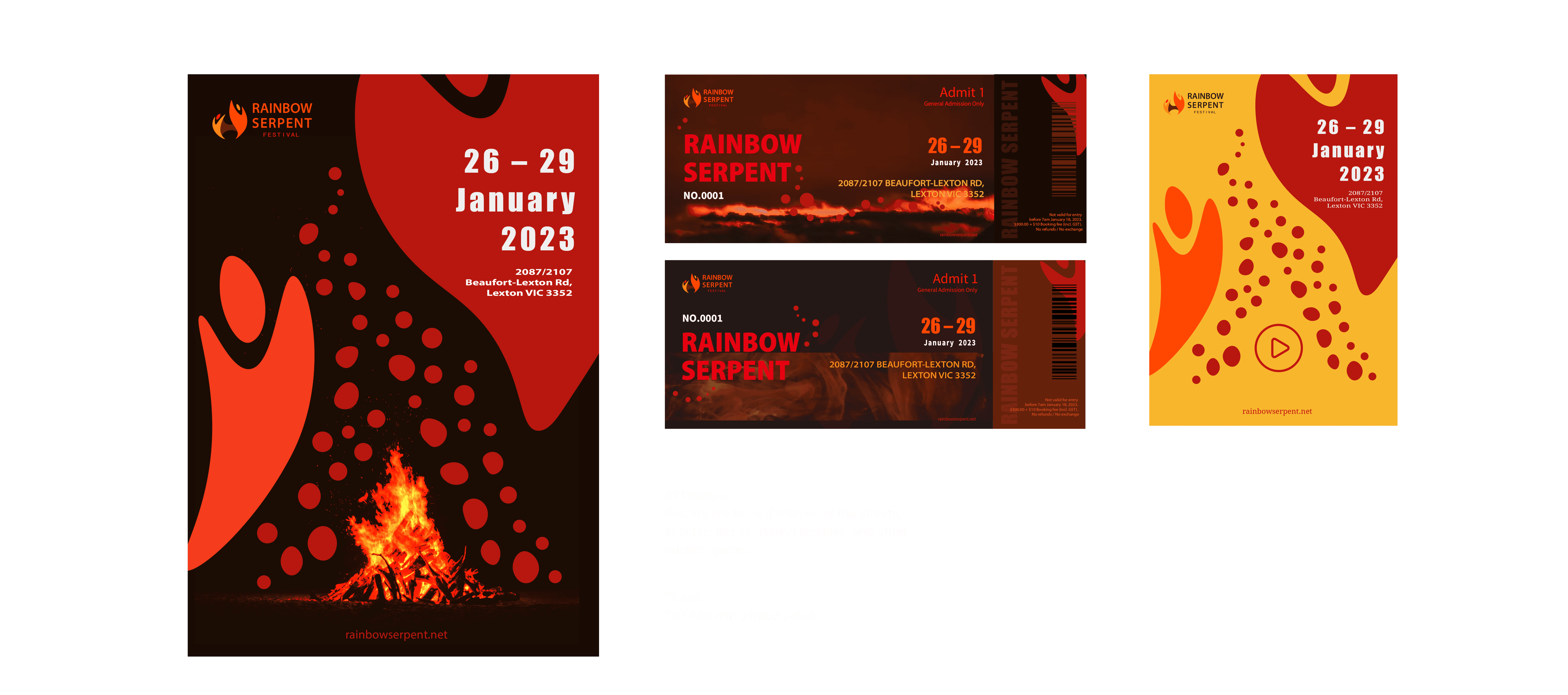 In the design of posters and tickets, the use of red and orange for both text and imagery against a deep brown background aims to create a vibrant depiction of people coming together at night to enjoy rock music. Additionally, incorporating images with flame elements reflects the festival's values of embracing the unknown and facing challenges head-on. It's worth noting that, considering children are often drawn to bright and colorful visuals, a special bright yellow poster was also created to attract them to experience the enchantment of music and art at the Rainbow Serpent Festival.