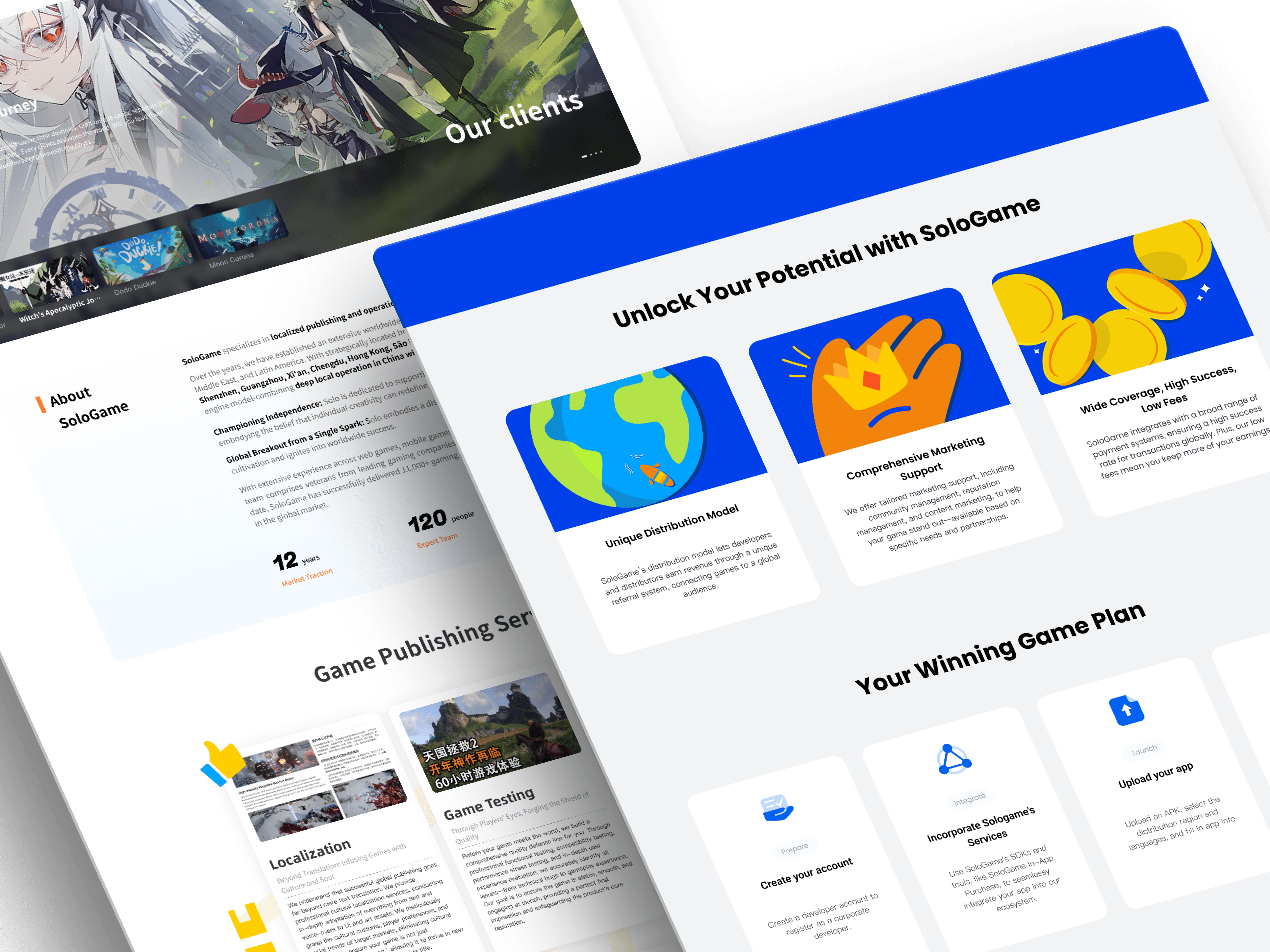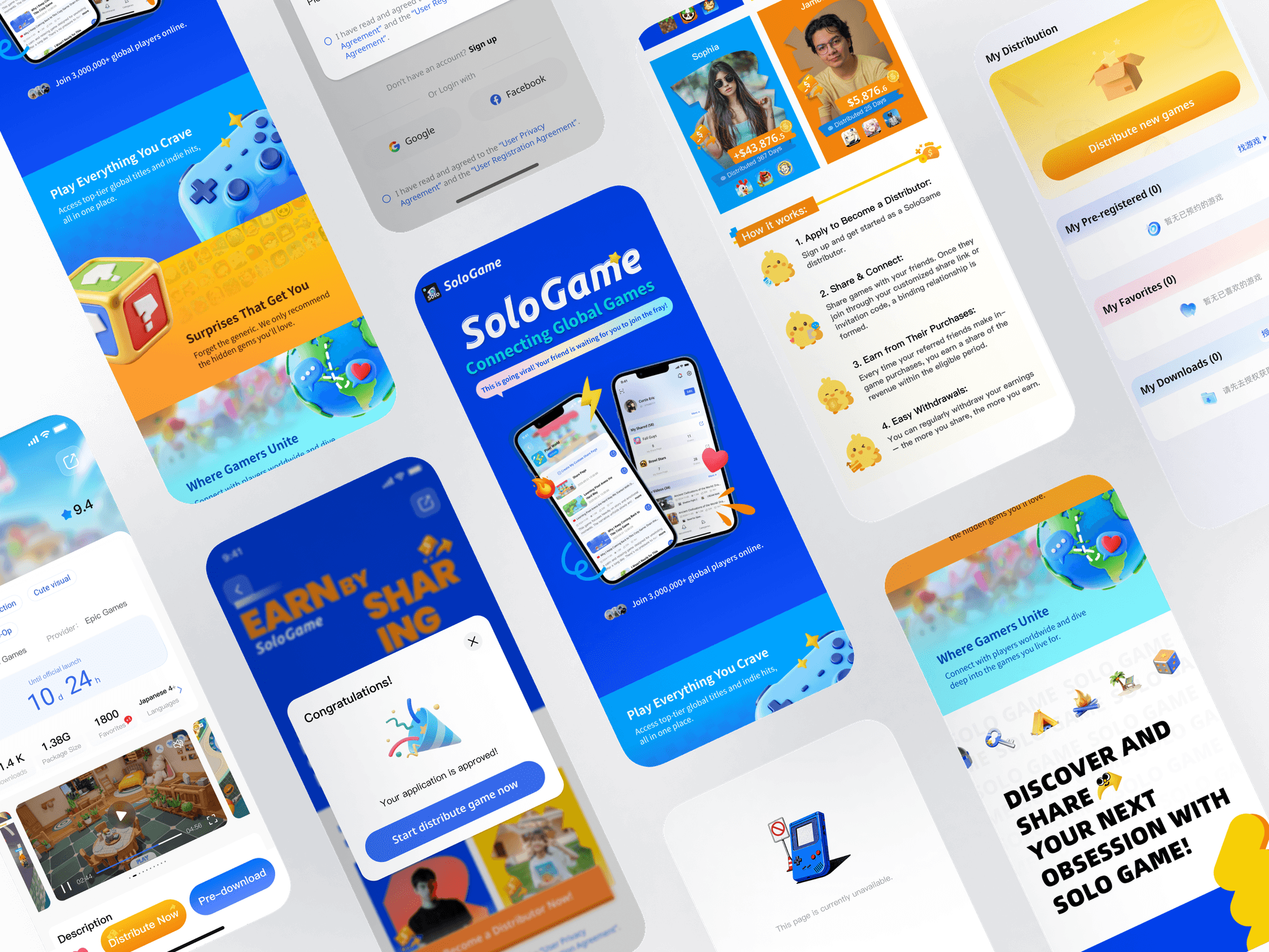 SoloGame is a game community platform targeting European and North American markets. I led the UI design across multiple touchpoints, including mobile app, H5, web official site, developer portal, and backend management platform. By creating a unified visual system, color strategy, and interaction design, I enhanced cross-platform user experience, strengthened the platform’s professionalism and approachability, and ensured cultural adaptation for overseas markets.